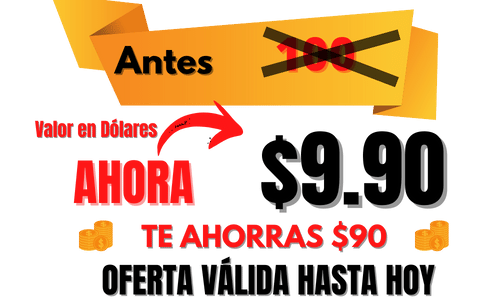 Si Tomas Acción en los Próximos 5 minutos HOY OBTIENES este SUPER DESCUENTO del 90%, para que no pagues los $ 100.00 que vale este Curso y pagues tan SOLO $ 9,90 Dólares que pagarás en tu moneda local.